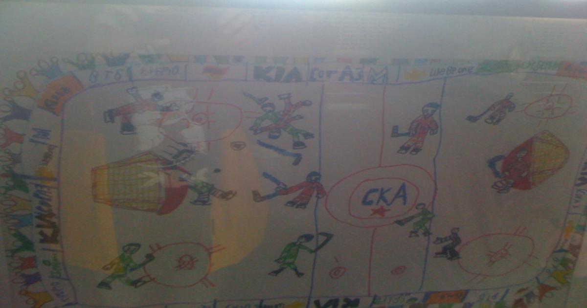 Обратите внимание как на верхнем рисунке тщательно прописаны все рекламодатели)) Это главное. Еще очень важный момент - "Салават Юлаев", это самый нелюбимый в Магнитогорске коллектив и я думаю, что зеленые цвета побитых человечков - это его. А то что подписано СКА - так это, наверно. ребенок еще не понимает...