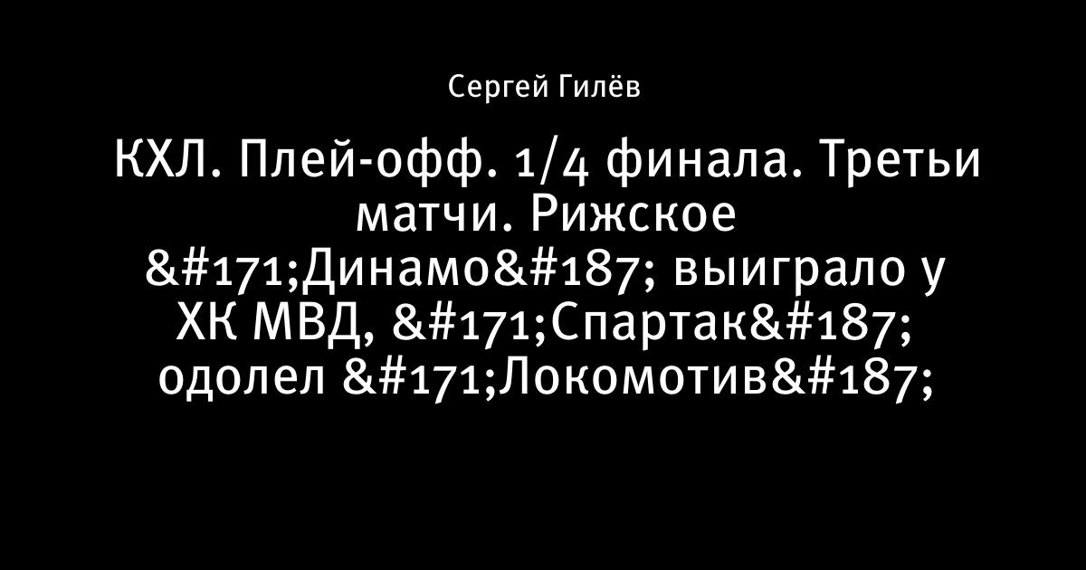 23 марта 2010, 12:08 КХЛ. Плей-офф. 1/4 финала. Третьи матчи. Рижское «Динамо» выиграло у ХК МВД, «Спартак» одолел «Локомотив» Спартак Локомотив 3:2 (1:1, 2:1, 0:0) Динамо Рига ХК МВД 3:1 (1:1, 1:0, 1:0) Автор Сергей Гилёв Этот пост опубликован в блоге на Трибуне Sports.ru. Присоединяйтесь к крупнейшему сообществу спортивных болельщиков! Другие посты блога Айс-ТВ