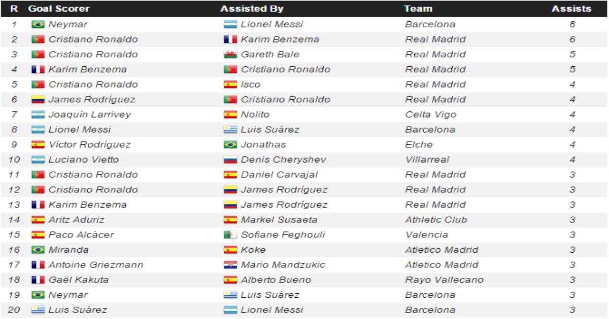 Лидируют в рейтинге Неймар и Месси: бразилец забил с передач аргентинца 8 голов. Следующие 5 строчек заняты представителями «Реал Мадрида», лучшими среди которых являются Роналду и Бензема: француз ассистировал лучшему бомбардиру турнира 6 раз, в обратную сторону проследовали 5 результативных передач. В первой десятке нашлось место всего трём испанцам (Иско, Нолито и Виктору Родригесу), зато в неё попал россиянин Денис Черышев, отдавший своему одноклубнику Лусиано Вьетто 4 передачи на гол.