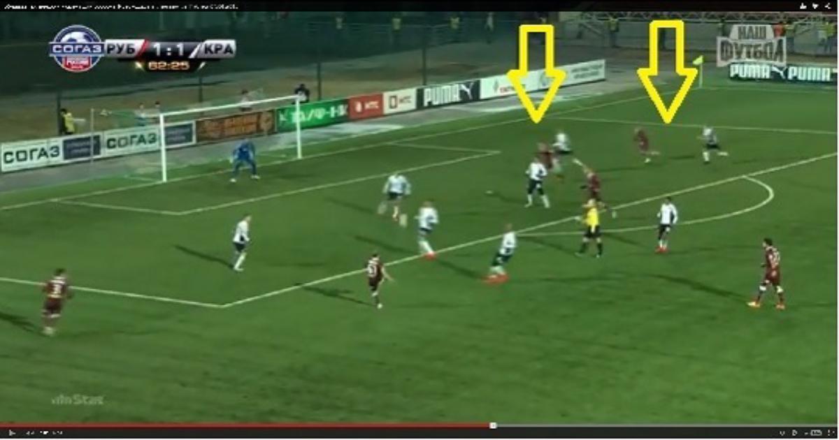 Получается, здесь поздно отреагировали на ситуации именно левый и левый центральные защитники. Они не успели перестроиться. Это хорошо видно и в момент подачи Карадениза, когда оба краснодарца не успевают за соперниками.
