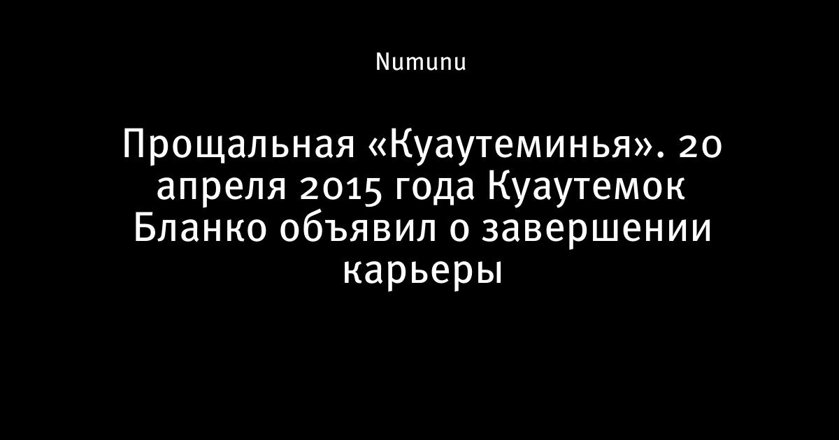 22 апреля 2015, 21:00 Прощальная «Куаутеминья». 20 апреля 2015 года Куаутемок Бланко объявил о завершении карьеры Автор Numunu Этот пост опубликован в блоге на Трибуне Sports.ru. Присоединяйтесь к крупнейшему сообществу спортивных болельщиков! Другие посты блога Вы это видели? Куаутемок Бланко Сборная Мексики по футболу Джанлука Дзамбротта Сборная Италии по футболу Пуэбла
