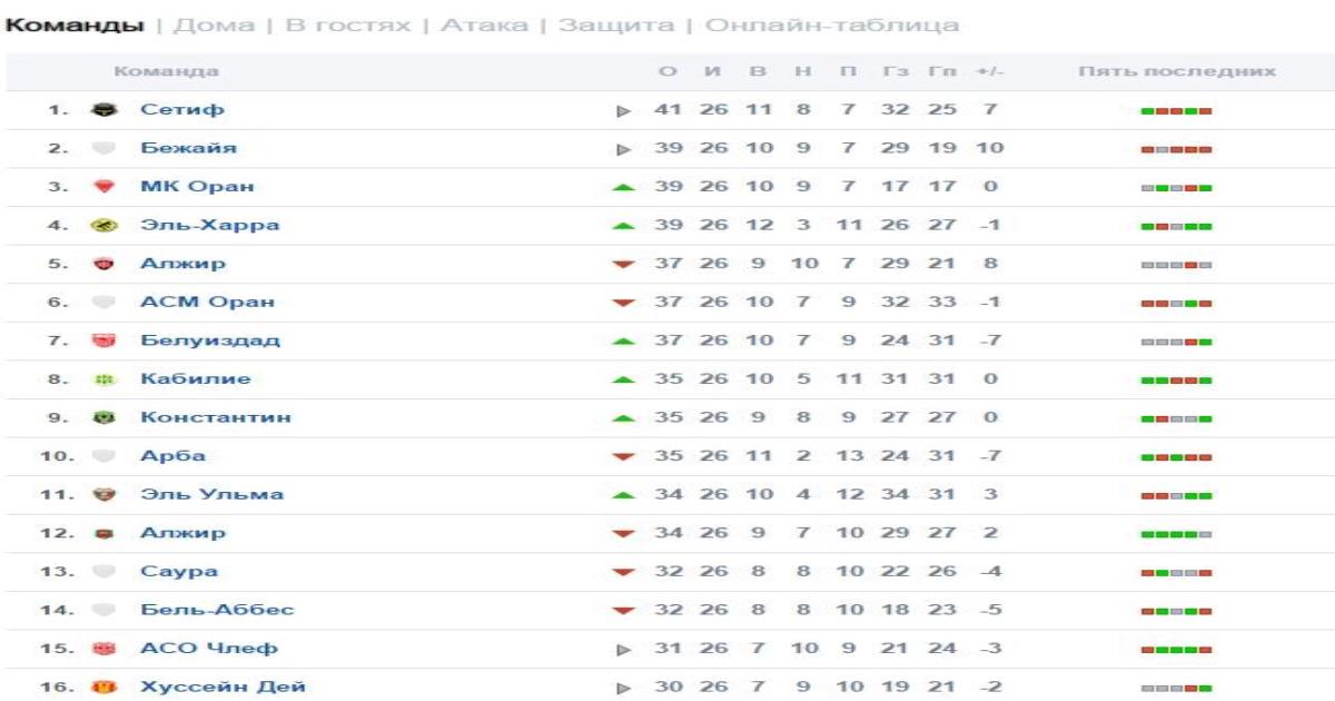 Лидирует в чемпионате Алжира клуб «Сетиф», который опережает последнюю команду всего на 11 очков. Даже у клуба «Хуссейн Дейн», замыкающего турнирную таблицу, есть еще теоретические шансы на победу в чемпионате.