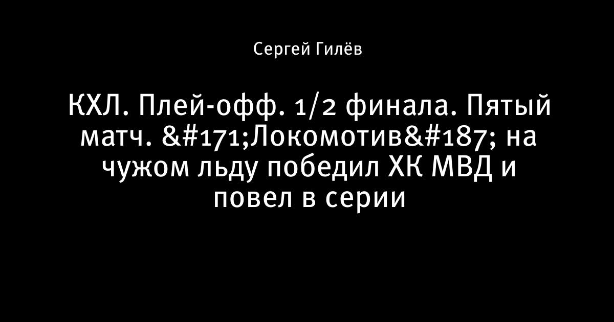 8 апреля 2010, 00:49 КХЛ. Плей-офф. 1/2 финала. Пятый матч. «Локомотив» на чужом льду победил ХК МВД и повел в серии ХК МВД Локомотив 0:4 (0:1, 0:1, 0:2) Автор Сергей Гилёв Этот пост опубликован в блоге на Трибуне Sports.ru. Присоединяйтесь к крупнейшему сообществу спортивных болельщиков! Другие посты блога Айс-ТВ