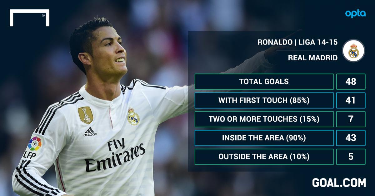 Целых 85% голов были забиты португальцем первым же касанием мяча, а 25%, то есть 12 - головой, что является наивысшим показателем за всю его карьеру. Для сравнения, в первый свой сезон в Мадриде действующий обладатель «Золотого мяча» 61% мячей отправил в сетку в одно касание, и лишь 12% составили голы головой.