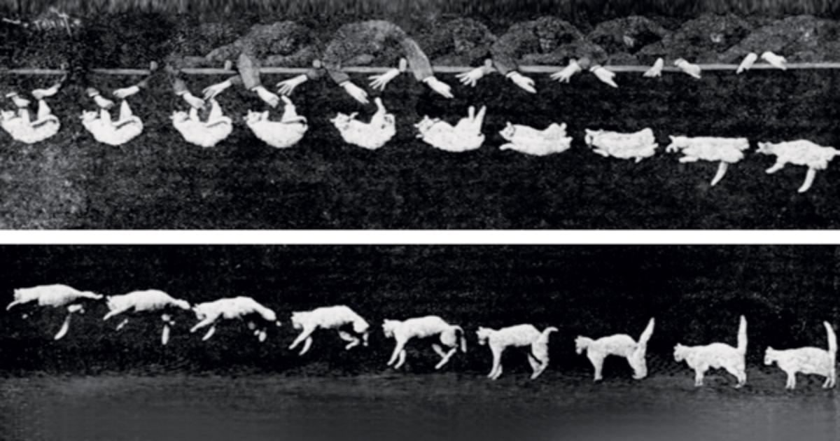 В 1894 году французский физик Этьен-Жюль Марей, используя изобретённую им фотоустановку со скоростью съёмки около 30 кадров в секунду, снял полёт кошки, сброшенной с небольшой высоты:
