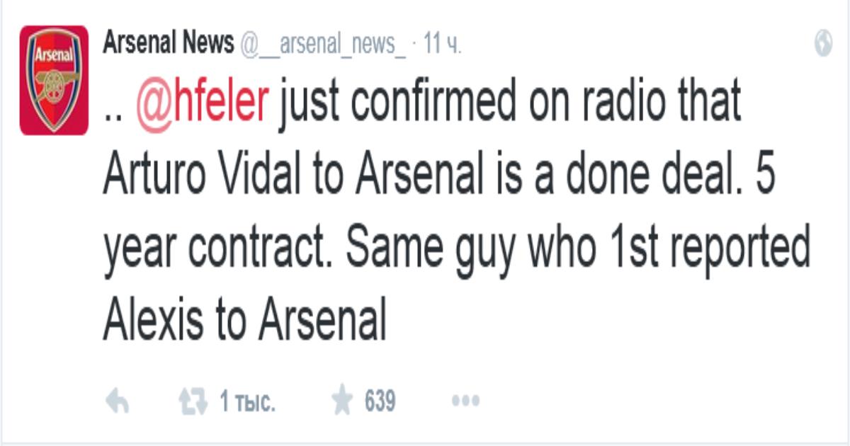@hfeler подтвердил на радио, что Артуро Видаль подписал 5-летний контракт с Арсеналом. Это тот же парень, который первый сообщил о переходе Санчеса.