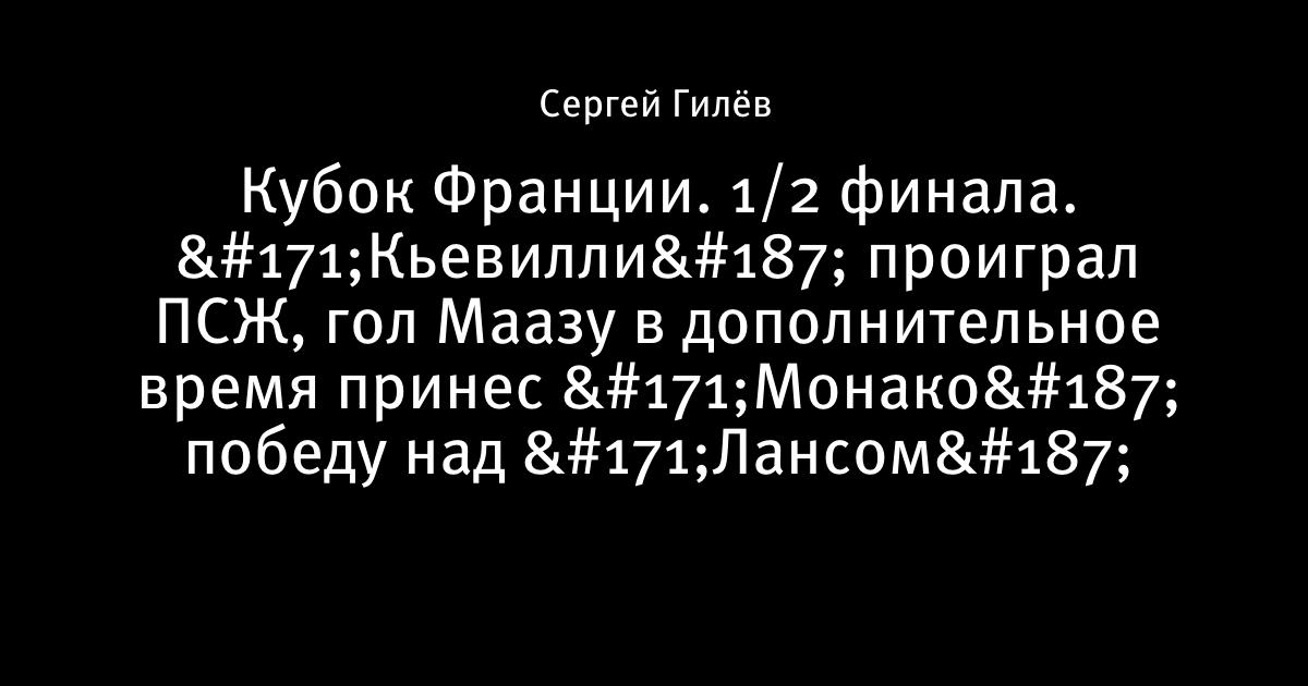 15 апреля 2010, 12:20 Кубок Франции. 1/2 финала. «Кьевилли» проиграл ПСЖ, гол Маазу в дополнительное время принес «Монако» победу над «Лансом» Монако Ланс 1:0 Кьевилли ПСЖ 0:1 Автор Сергей Гилёв Этот пост опубликован в блоге на Трибуне Sports.ru. Присоединяйтесь к крупнейшему сообществу спортивных болельщиков! Другие посты блога Разборки в олимпийском Париже