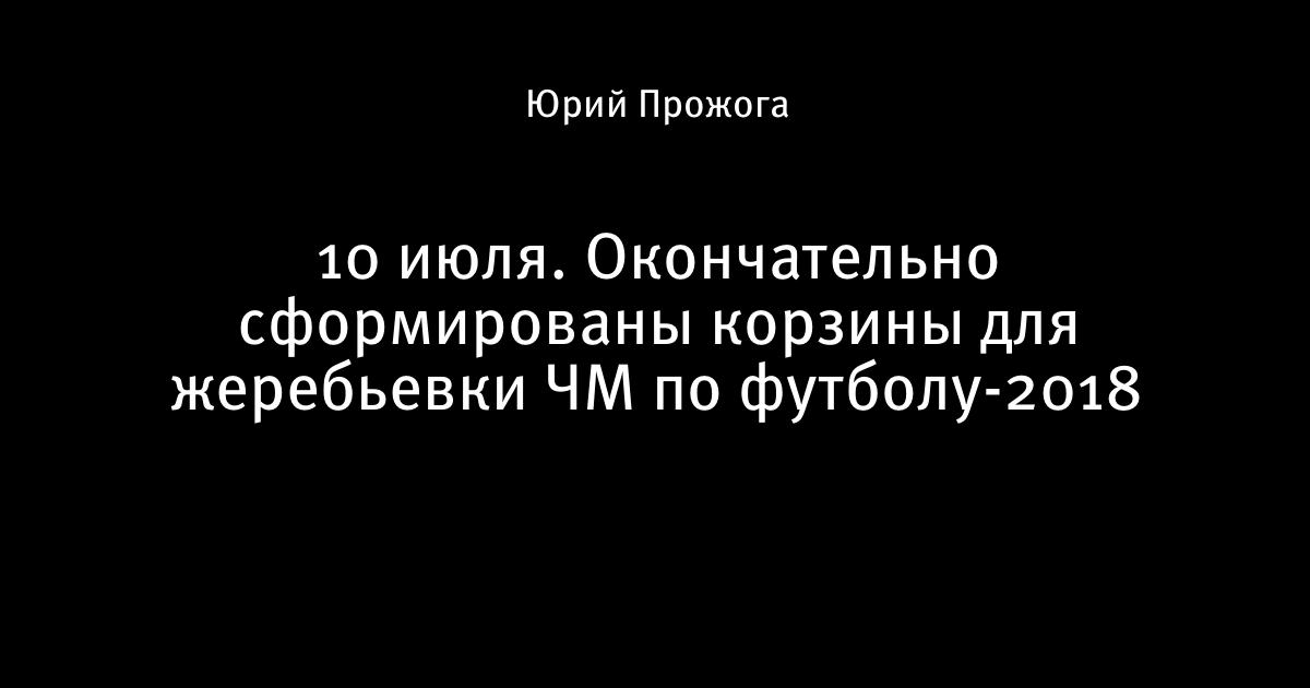 10 июля 2015, 16:44 10 июля. Окончательно сформированы корзины для жеребьевки ЧМ по футболу-2018 Автор Юрий Прожога Этот пост опубликован в блоге на Трибуне Sports.ru. Присоединяйтесь к крупнейшему сообществу спортивных болельщиков! Другие посты блога Рисую спорт ЧМ-2018 FIFA
