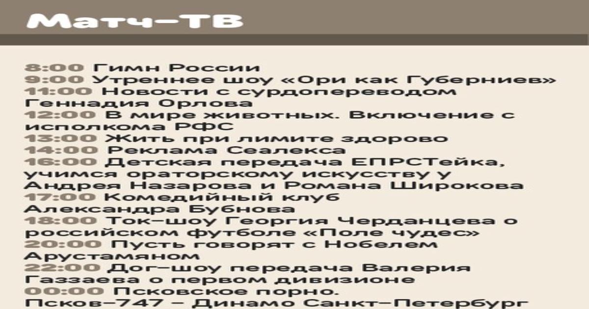 Кстати, общедоступный спортивный канал, который будет доступен с 1 сентября, будет называться... МАТЧ-ТВ. Редакция нашего паблика раздобыла телепрограмму этого канала (от друзей из паблика Что с тобой не так, спорт?