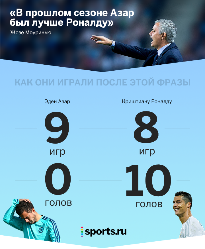 Прошлый сезон Азар(г+п) - 24 очка. Роналду - 64 очка........так было бы правильнее.....и для нытиков класса "Пеналду" за вычетом голов с пенальти Азар - 21 очко, Роналду - 54 очка........Но Азар сильнее......Моур врать не будет!!!!!