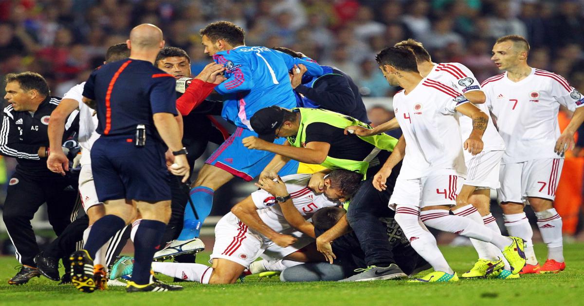 После того, как определились составы отборочных групп к первенству континента, всеобщему удивлению не было предела. Непримиримые Албания и Сербия попали в одну группу. У стран есть огромная ненависть к друг другу на политической почве, которая выплескивается наружу и в футбольной сфере. Об этом наглядно свидетельствует первая игра оппонентов в группе, когда сборные пересеклись в Сербии. Та игра так и не была доиграна из-за беспорядков. Как вы помните, та встреча в октябре 2014 года была прервана на 42-ой минуте, после того как над полем появился дрон с провокационным флагом. После того, как флаг сорвал сербский защитник Митрович, на поле начались стычки между игроками и болельщиками, которые выбежали на газон. Вдобавок, по ходу первого тайма с трибун летела пиротехника. Не обошлось и без стычек фанатов за пределами поля и других беспорядков. В итоге, сербам было присуждено техническое поражение и снято с команды три очка, что долгое время оставляло сборную Сербии с минусовым показателем в группе и вообще серьезно повлияло на их настрой в отборочном турнире.