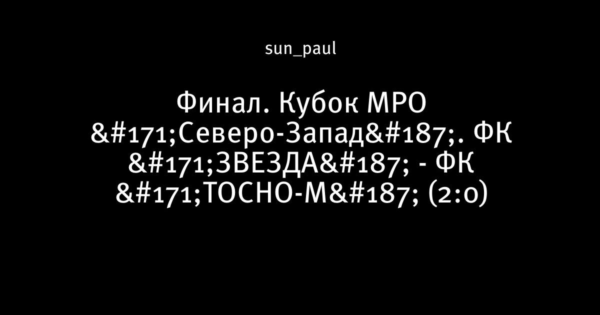 22 октября 2015, 18:30 Финал. Кубок МРО «Северо-Запад». ФК «ЗВЕЗДА» - ФК «ТОСНО-М» (2:0) 1 Автор sun_paul Этот пост опубликован в блоге на Трибуне Sports.ru. Присоединяйтесь к крупнейшему сообществу спортивных болельщиков! Другие посты блога Футбольная жизнь Петербурга Звезда Санкт-Петербург (до 2014) Тосно
