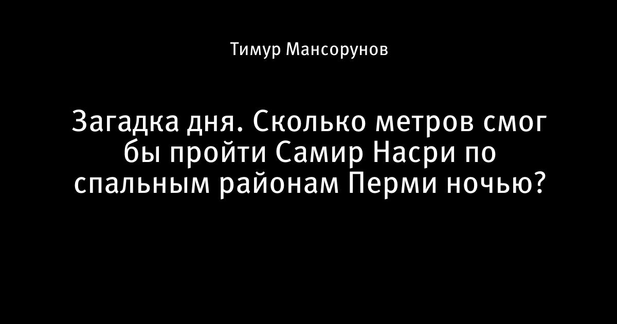 26 октября 2015, 18:42 Загадка дня. Сколько метров смог бы пройти Самир Насри по спальным районам Перми ночью? Автор Тимур Мансорунов Этот пост опубликован в блоге на Трибуне Sports.ru. Присоединяйтесь к крупнейшему сообществу спортивных болельщиков! Другие посты блога Объектив Самир Насри