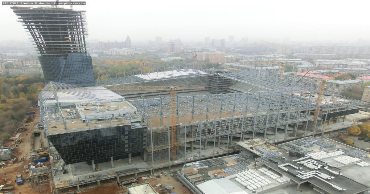 Юг. Разобрали башенный кран. Идёт внутренняя отделка. Установили первое кресло. Привезли образцы внешних (?) ограждений. На подземной парковке устанавливают колёсоотбойники. Обрабатывают монолитную гребёнку скайбоксов.