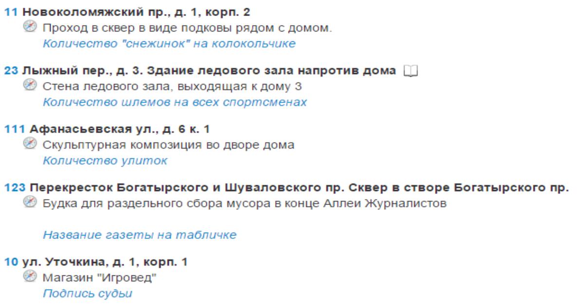 Задания на контрольных точках бывают нескольких типов, чаще всего требуется или что-то посчитать, или что-то срисовать, или что-то записать. На приведенных выше картинках задания написаны синим курсивом: "Количество улиток" или "Название газеты на табличке".