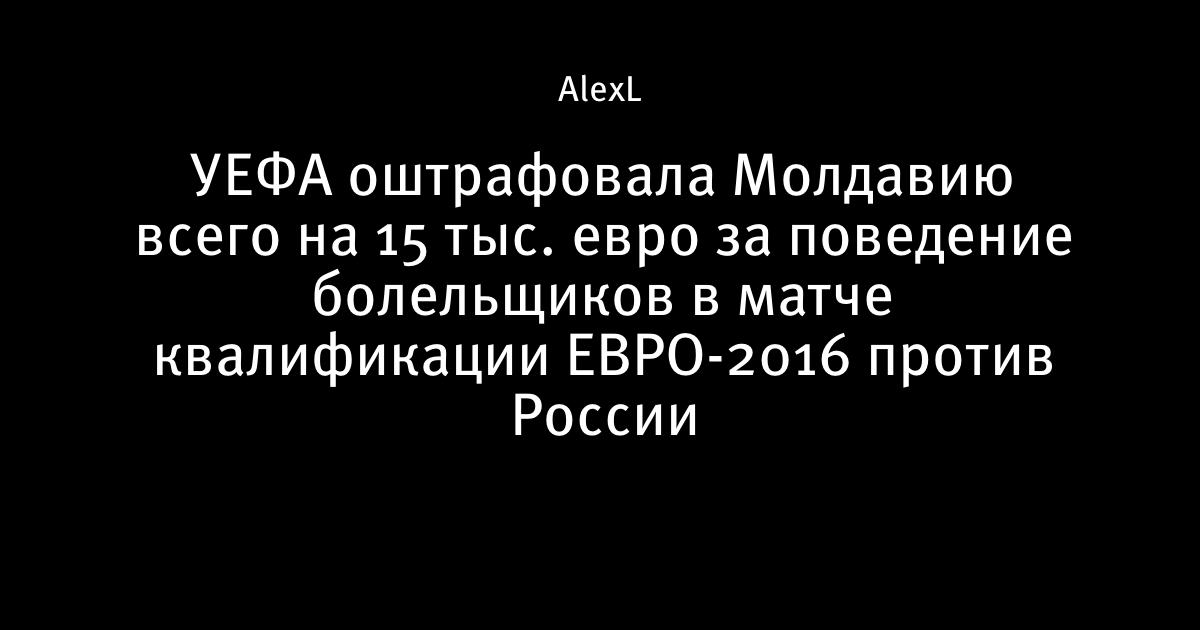 КДК УЕФА оштрафовала федерацию футбола Молдавии всего-то на 15 тыс. евро за поведение болельщиков на матче квалификации к ЕВРО-2016 с Россией (1:2) и закроет один сектор в следующем домашнем матче этой сборной. Россия в том матче победила молдаван со счетом 2-1.