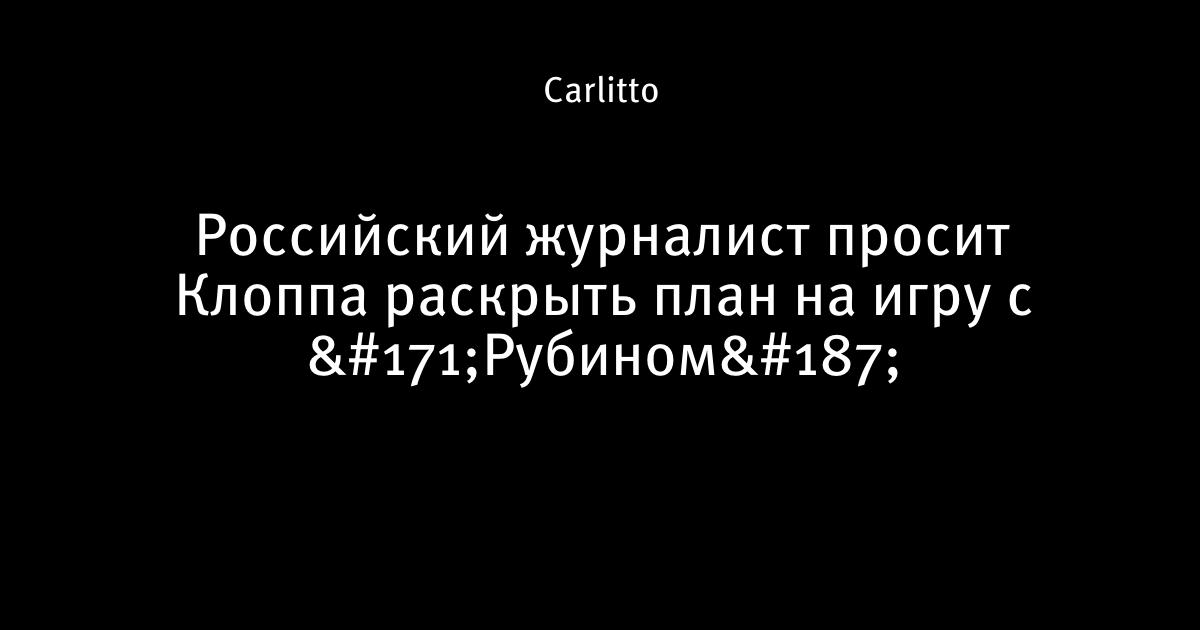 5 ноября 2015, 22:02 Российский журналист просит Клоппа раскрыть план на игру с «Рубином» 1 Автор Carlitto Этот пост опубликован в блоге на Трибуне Sports.ru. Присоединяйтесь к крупнейшему сообществу спортивных болельщиков! Другие посты блога Телевизор 3.0 Рубин Юрген Клопп Ливерпуль
