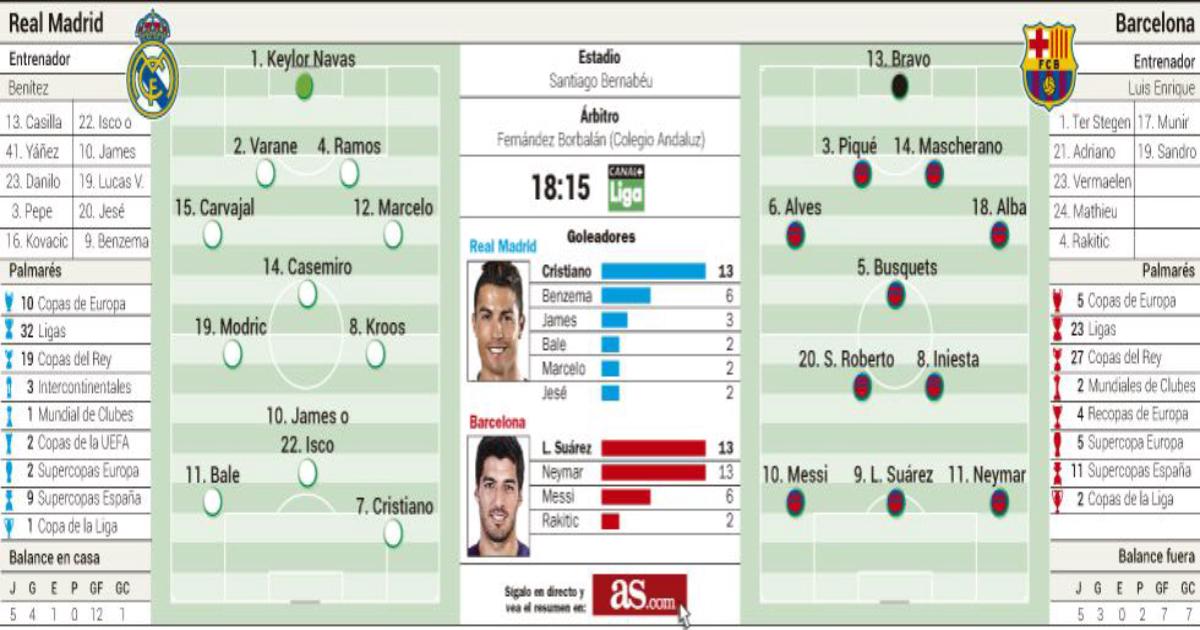 "Реал Мадрид" чаще забивает в левый нижний от вратаря угол (14 голов), "Барселона" в правый (15 голов). Лучшими бомбардирами команд являются легионеры: Криштиану Роналду (8) и Карим Бензема (6) у "Реала"; Неймар (11) и Луис Суарес (9) у "Барселоны"