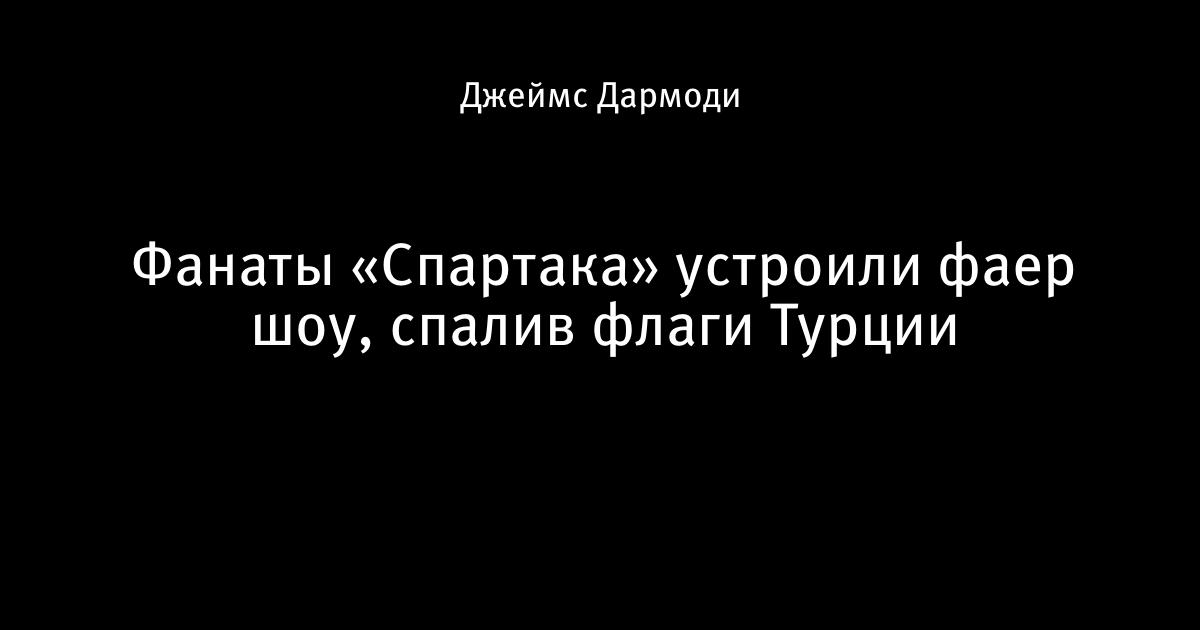 5 декабря 2015, 10:34 Фанаты «Спартака» устроили фаер шоу, спалив флаги Турции 1 Автор Джеймс Дармоди Этот пост опубликован в блоге на Трибуне Sports.ru. Присоединяйтесь к крупнейшему сообществу спортивных болельщиков! Другие посты блога Телевизор 3.0 болельщики Лукойл Арена премьер-лига Россия Сборная Турции по футболу Крылья Советов Спартак происшествия