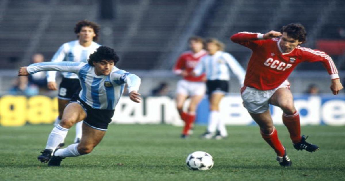 31 марта 1988 года, Восточный Берлин, матч сборных Аргентины и СССР. Диего Марадона и Олег Протасов.