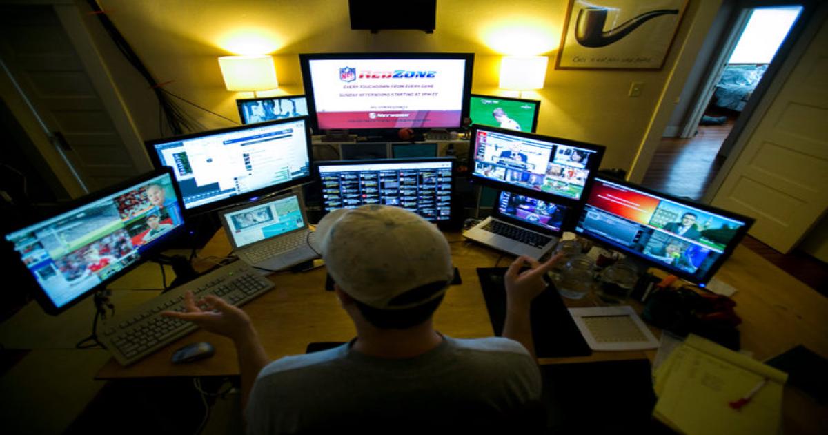 На фото - Тим Берк, одновременно просматривает 28 спортивных событий на 10 экранах, чтобы оперативно делать GIF’ки из знаменательных моментов спорта.