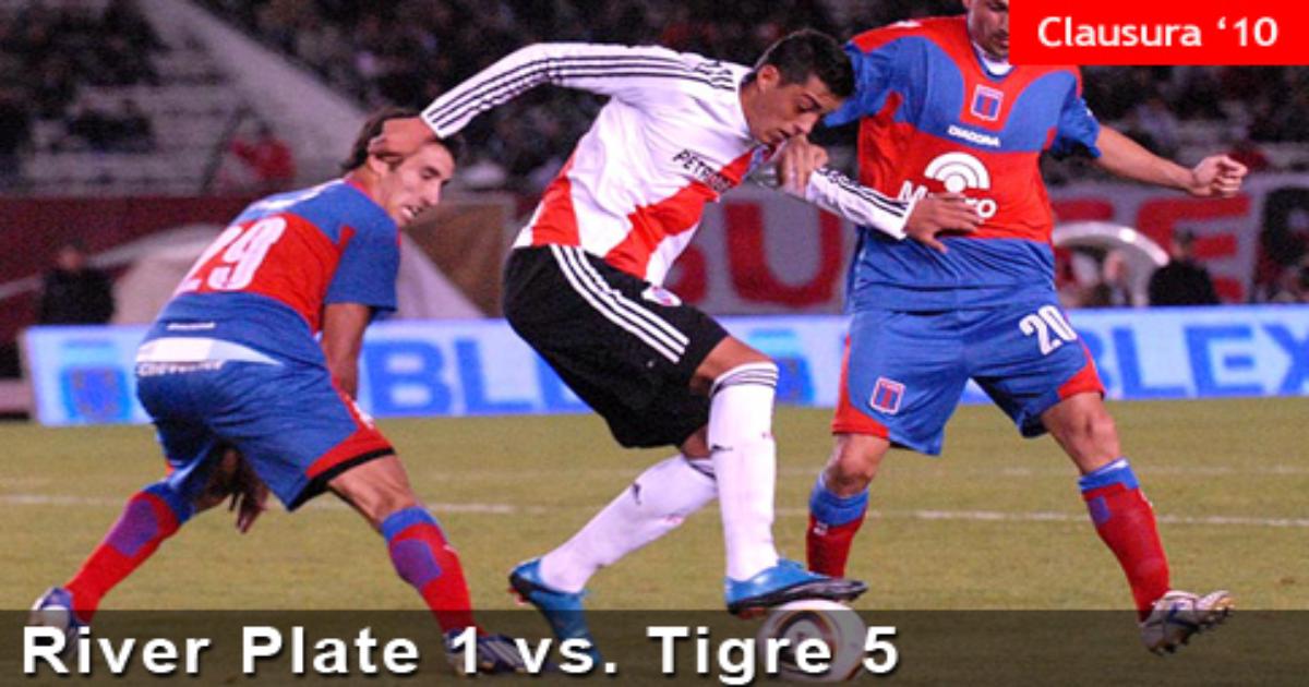 Странный получился матч... Узнав счет, думал, как же это Тигре так мог переиграть хозяев? Оказалось, игра была почти что равная, даже бы сказал, что Ривер вел игру, но как он легко напропускал... Первый мяч - Кирога не удержал Переса. Второй - (спустя две минуты) "бомбасо" Сан Романа (Вега все же далековато вышел). Третий - (спустя 6 минут) неразбериха в штрафной при подачи Тигре с углового. Четвертый - хиртоумно сыграл игрок Тигре, пропустивший мяч между ног на Пасини, и последний преспокойно увеличивает разницу в счете. Пятый - обрез Кироги.