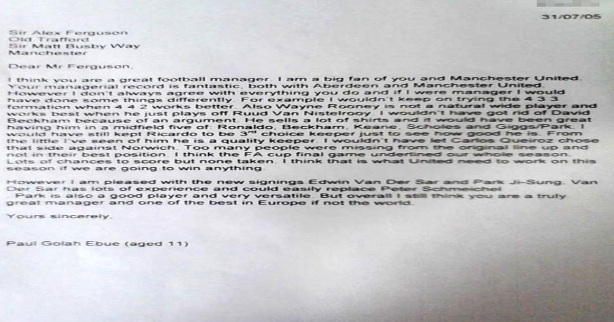 Сложно представить, даже практически невозможно, например, чтобы нынешний тренер «МЮ» ответил на письмо одного из поклонников, каким бы критичным оно ни было. А именно так было 10 лет назад, когда Алекс Фергюсон ответил 11-летнему лондонскому фанату «дьяволов» по имени Пол Гола-Эбу. Совсем недавно парень признался в этом и даже предъявил скан обоих писем.