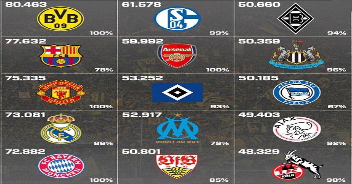 Удивительно , но у нынешнего обладателя кубка ЛЧ самая низкая посещаемость в % среди этого списка , всего 77000. Видимо в Барселоне не очень любят футбол. Кстати , это больше , чем забитые до отвалу Альянц-Арена и Олд Траффорд.