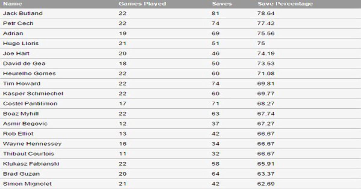 Таблицу возглавляет голкипер "Сток Сити" Джек Батленд. А замыкает вратарь "Ливерпуля" Симон Миньоле.