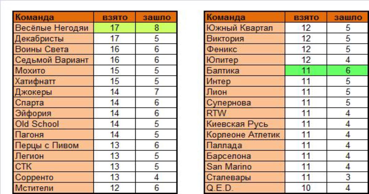 Команды, использовавшие наибольшее число вариантов: Весёлые Негодяи и Декабристы (по 17 вариантов)