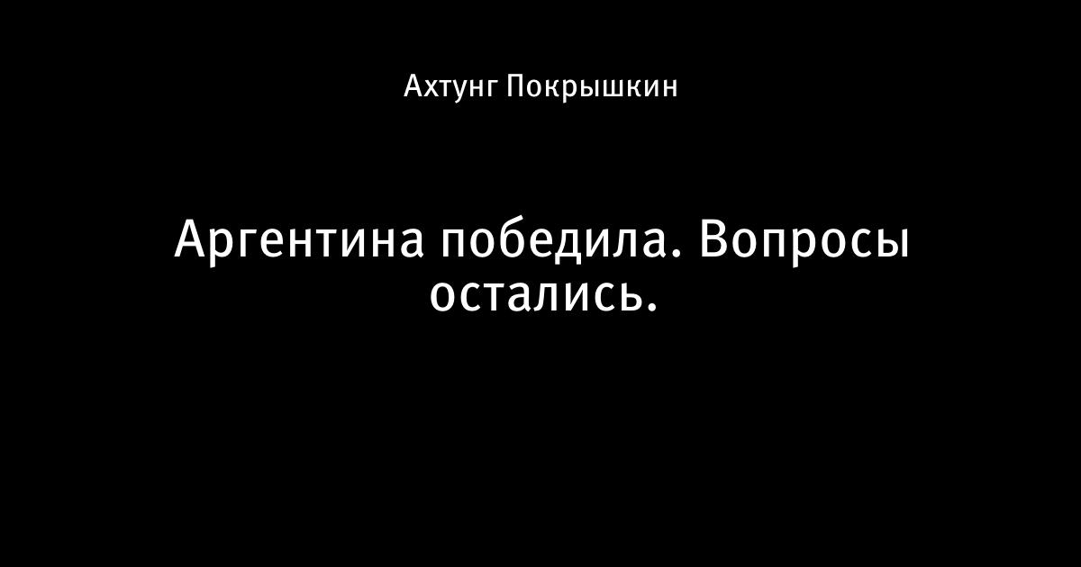 Начал смотреть вживую только с 55 минуты. И наблюдал, как корейцы практически наравне играли против команды Марадоны. Аргентинцы казались медлительными и в обороне, и в полузащите, и в атаке. Хайнце решил что он играет то ли центрального полузащитника, то ли фантазисто, левый фланг провисал, корейцы имели реальный шанс сравнять счет, но... Выход Агуэрры решил исход матча. Вроде ничего особенного не поменялось, но изменилась химия игры, как капля амбры или пачули меняет аромат духов. Понеслись кружева у штрафной азиатов, даже Игуаин оказался к месту, вколачивая голы с двух метров как гвозди. Против этого корейцам противопоставить было уже нечего. Но ошибка Димичелиса, авантюрная игра Хайнце, травма Самуэля и нежелание атакующих игроков отрабатывать сзади оставляют вопросы о том, хватит ли такой игры Аргентине, чтобы пройти далеко. Или они смогут перестроиться?