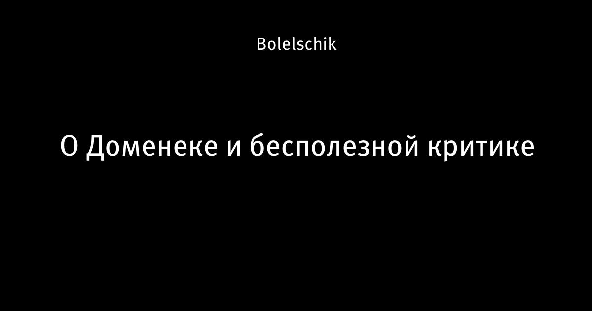 Видите, не сейчас начали славные люди упражняться в критике Раймона Доменека. Хотя эта история о другом - о том, что такие люди были всегда и окружены совершенно любым видом общества. А вообще я считаю сейчас бессмысленным критиковать Доменека, потому что не понимаю, что нового можно привнести в эту критику; и что не было сказано до матча, решившего судьбу французской сборной на чемпионате мира. В истинном осмыслении произошедшего куда важнее противоположный оборот - разобраться, какая критика существенна, а какая надуманна. Я буду исходить из собственных наблюдений.