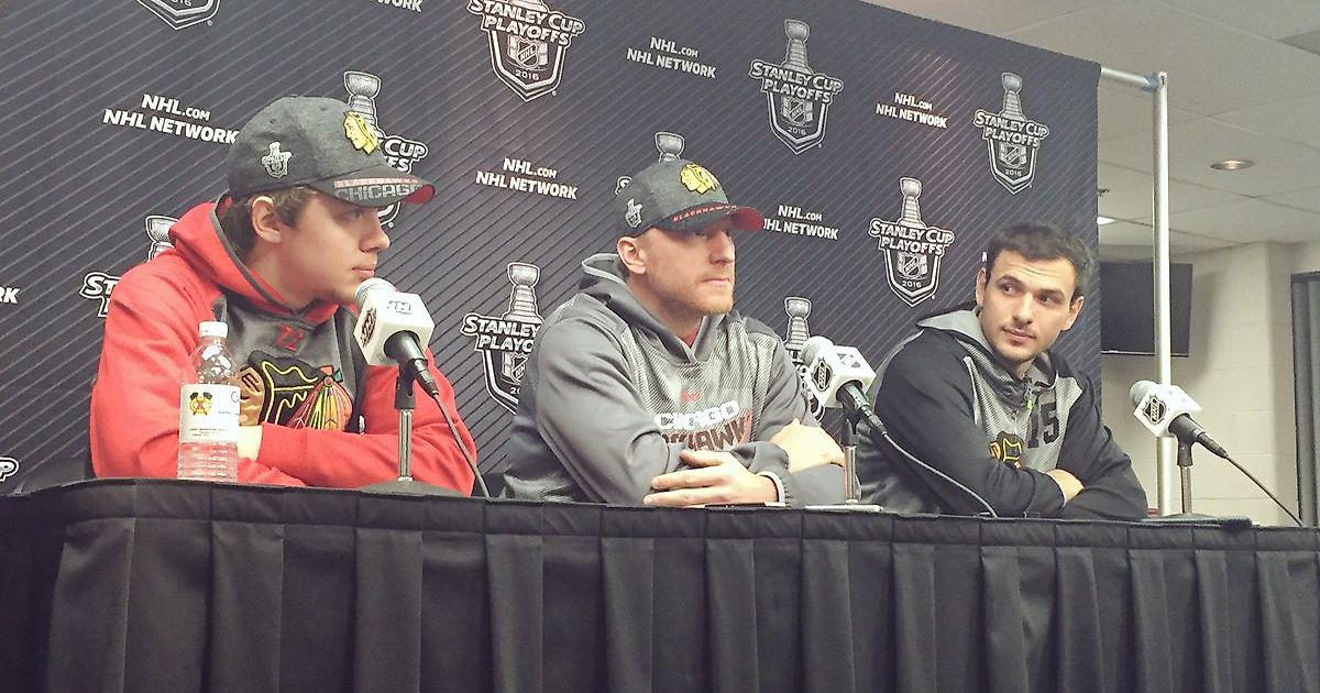 16 апреля хоккеисты "Блэкхокс", вернувшись в Чикаго, отвечают на вопросы прессы.