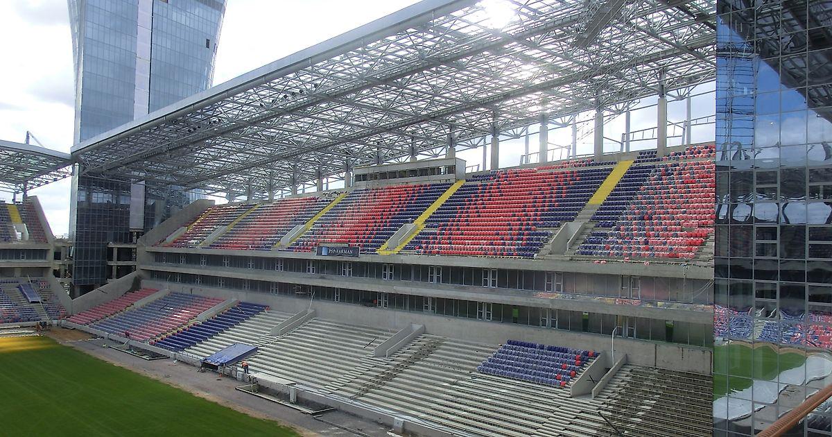 Запад. Продолжается внутренняя и внешняя отделка. Работают на крыше. Большие внешние лестницы штукатурят (затем покрасят). Устанавливают кресла, покрасили часть прохода на верхнем ярусе. Шлифуют бетон. Установили стёкла в комментаторские кабинки, делают перегородки. Перед первым ярусом устанавливают небольшое ограждение (такое же будет и на Востоке). Привезли образец кресел для скайбоксов с вышитой эмблемой клуба.