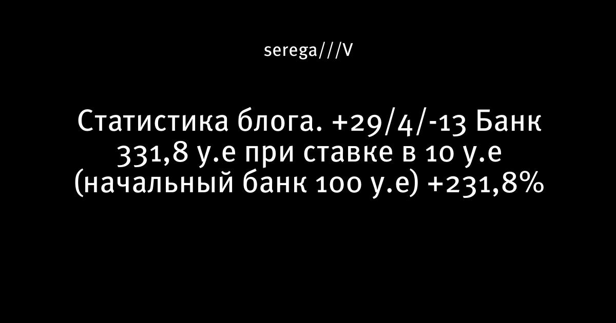 Статистика блога. +29/4/-13 Банк 331,8 у.е при ставке в 10 у.е (начальный банк 100 у.е) +231,8%