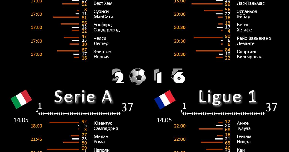 13.05.16 Вероятности исходов матчей чемпионатов Англии, Испании, Италии и Франции по мнению букмекеров