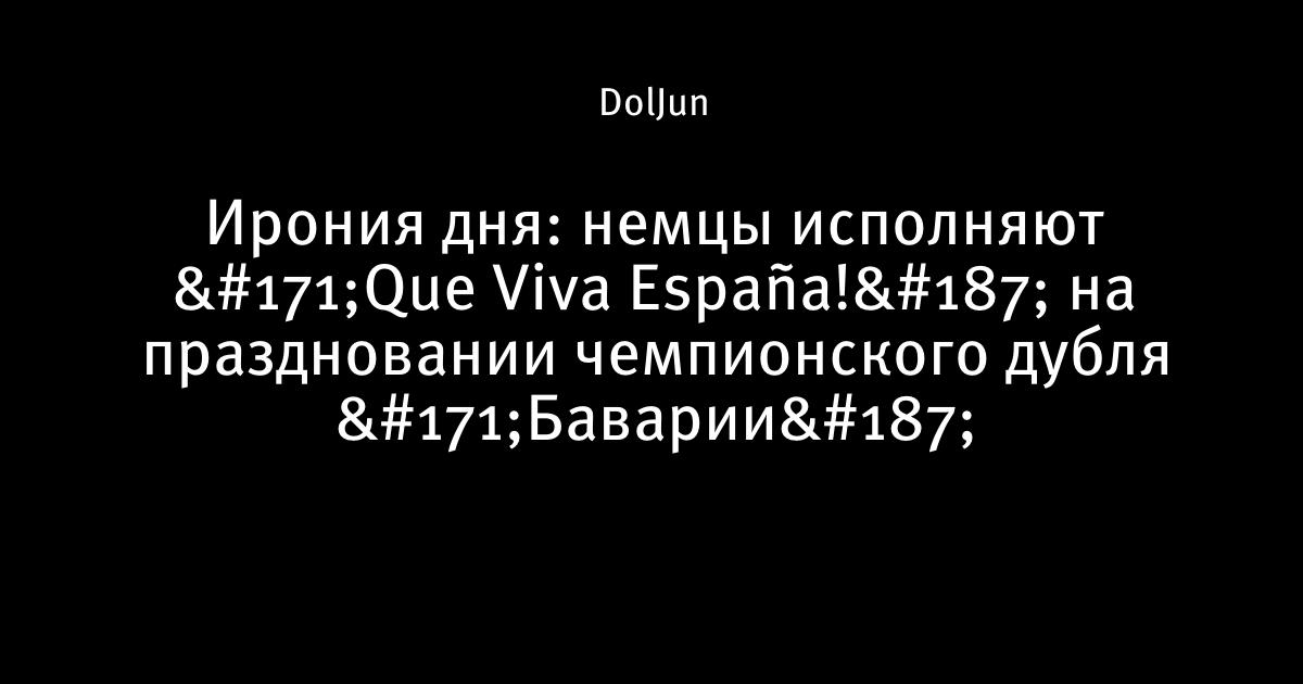 25 мая 2016, 09:22 Ирония дня: немцы исполняют «Que Viva España!» на праздновании чемпионского дубля «Баварии» 1 Автор DolJun Этот пост опубликован в блоге на Трибуне Sports.ru. Присоединяйтесь к крупнейшему сообществу спортивных болельщиков! Другие посты блога Вы это видели? Бавария Пеп Гвардиола