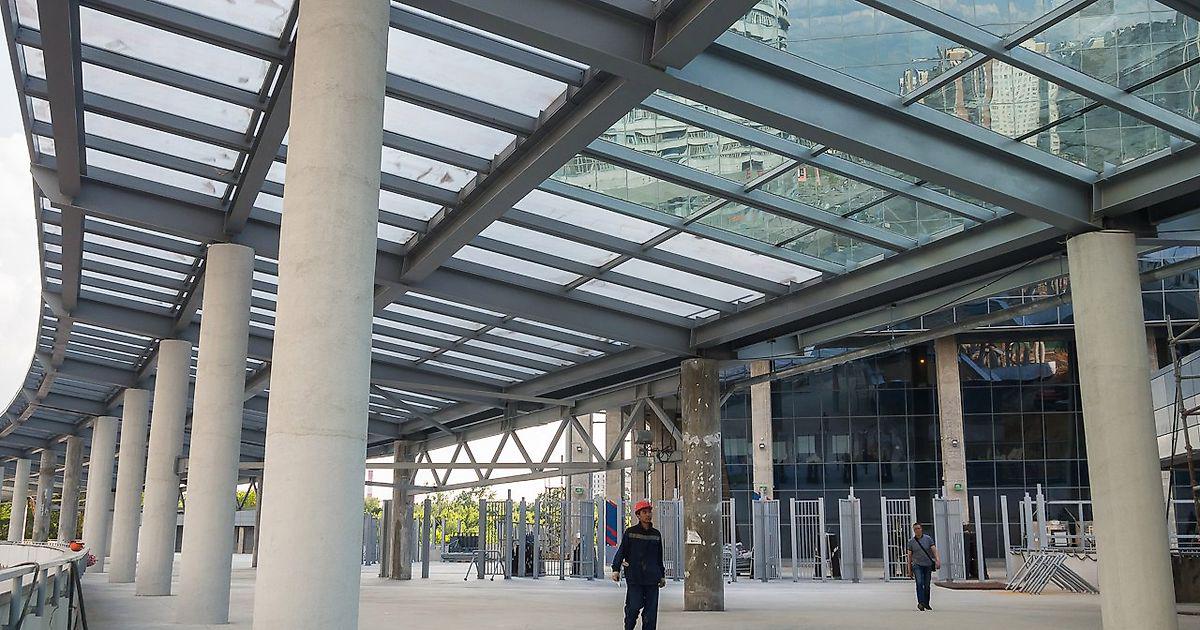 За пределами чаши всё те же работы, что и неделю назад, но прогресс заметный: навигационных указателей всё больше, заборы становятся длиннее, на северной входной группе начали устанавливать ворота на въезд.