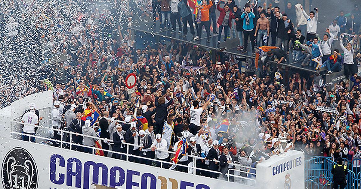 «Реал» сегодня вернулся домой из Милана, где накануне выиграл 11-й Кубок чемпионов. Автобус с футболистами и тренерами проехал по улицам Мадрида до Площади Сибелес, где традиционно празднует свои победы «королевский» клуб. Капитан мадридцев Серхио Рамос повязал клубный флаг на фонтан богини Кибелы.