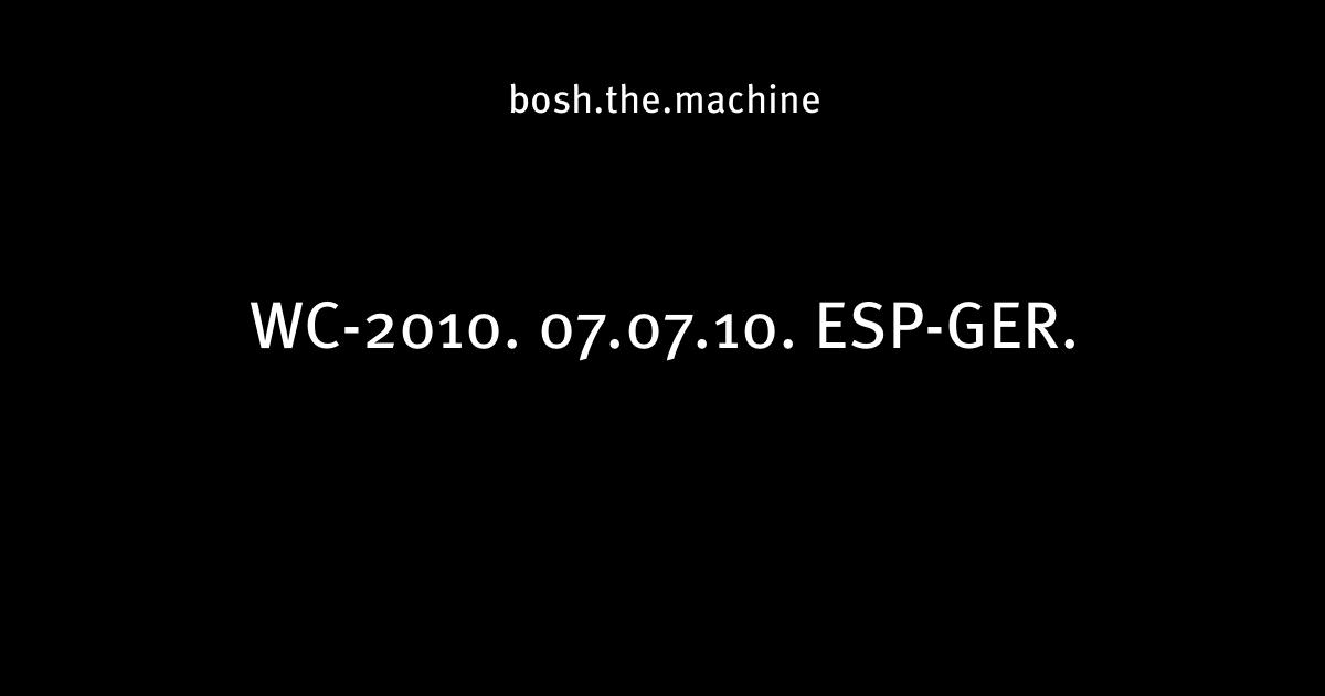 К матчу! Сборная Испании. Я не вижу лёгкости в их атаках. Всё как-будто через силу. Ноги те же, но как-будто в оковах. И не совсем о общекомандной скорости речь, а о чем-то незримом, что проявляется в «передержал», «недобежал», «слишком сильно» итд. И этот мажущий Торрес. Пасы Хави уже не так остры. Бьется Вилья, вьется Иньеста. Как располагаться на поле помнят, куда бежать знают, но получается раз через четыре. Так, что ли изучили их стиль, что научились если не пресекать полностью, то хотя бы локализовывать испанский пожар? Если с Хитцфельдом поверил бы, то в остальных случаях не совсем... И так, кстати, уже 5 матчей. Мучаются там что-то. Добивают от трех штанг могучий Парагвай. Такими вот глазами я вижу Красную Фурию. Немцы же... очень жаль, что не будет Мюллера. Тут даже не в том, что игрока потеряли, профессионала, а задор его, ту самую легкость, кураж что ли. Это может оказаться потерей.