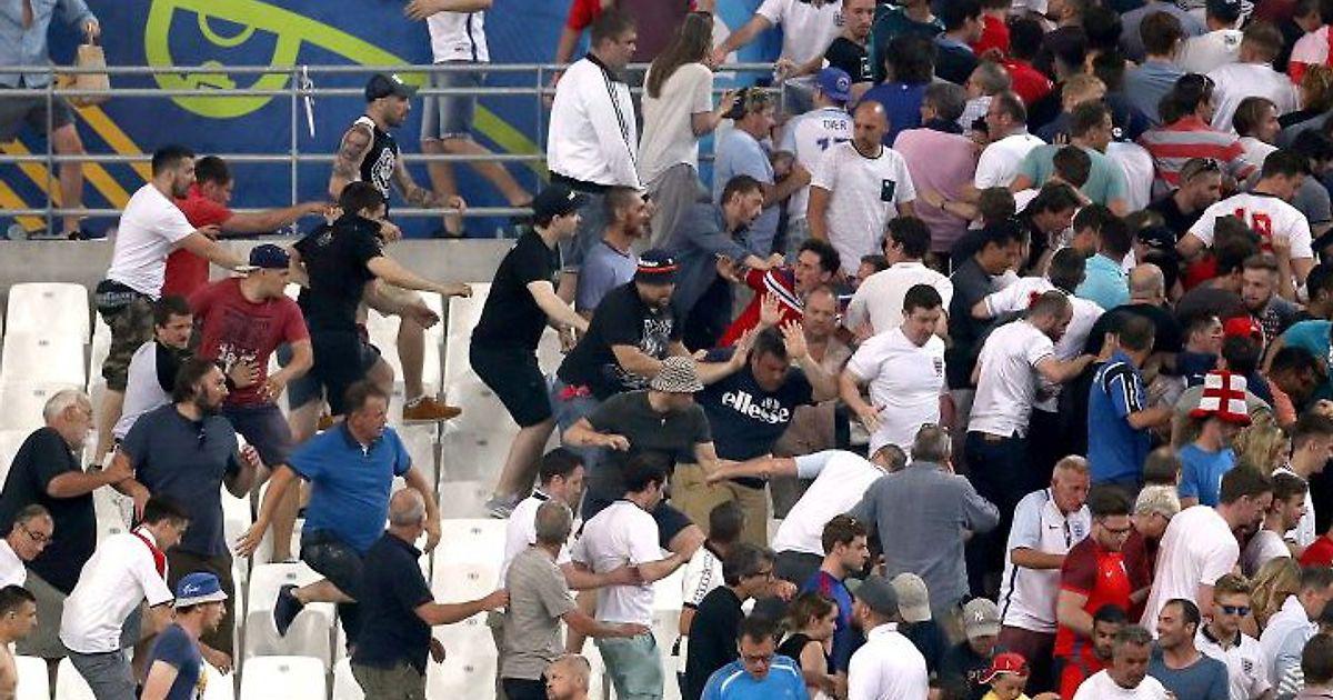После финального свистка в матче группового турнира Euro-2016 Англия – Россия на трибунах "Велодрома" началась драка. Российские фанаты массово ворвались в сектора с английскими и устроили драку. Отметим, что на том же секторе по ходу второго тайма российские фанаты жгли пиротехнику.