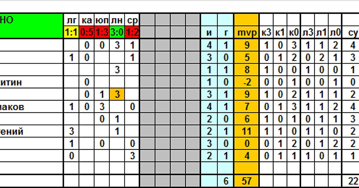 Исходы: +2=0-3, голы 7-12, 6 очков