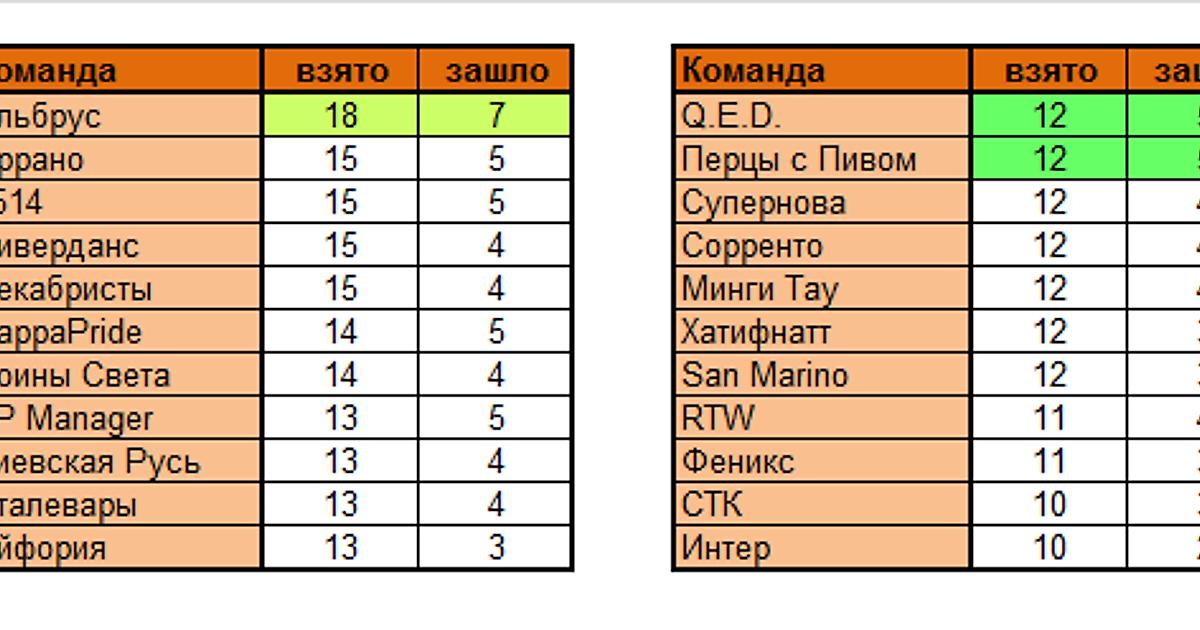 Команда, использовавшая наименьшее число вариантов: СТК и Интер (по 10 вариантов)