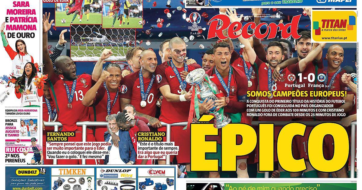 Португальские газеты сегодня немногословны, да это им и не нужно. "Гордость Португалии. Мы - чемпионы Европы", - этих слов вполне достаточно.