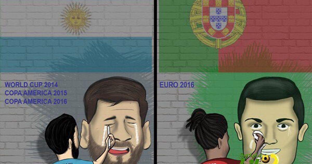 12 июля 2016, 12:00 Партнеры по команде бывают разными Месси с Аргентиной, и Роналду с Португалией Автор Алексей Меренков Этот пост опубликован в блоге на Трибуне Sports.ru. Присоединяйтесь к крупнейшему сообществу спортивных болельщиков! Другие посты блога Футбольные карикатуры 🎭 Евро-2016 Гонсало Игуаин Кубок Америки Лионель Месси Сборная Аргентины по футболу ЧМ-2014 Криштиану Роналду Сборная Португалии по футболу Эдер Маседу