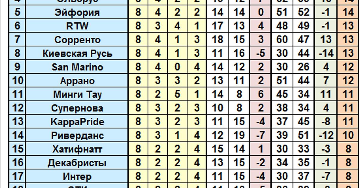 А вот 4-ый в турнире Эльбрус по УВ занял лишь 13-ое (!) место, разделив его с Аррано. Что сказать, выходит, что "горцам" частенько везло: когда они выступали не очень здорово, их соперники угадывали ещё меньше. Аррано с идентичным уровнем финишировали на 6 позиций ниже Эльбруса. Впрочем, стоит отметить высокую плотность в данном участке, между 4-ым и 13-ым всего 3 очка. Разрыв Эльбруса от Аррано составил 2 балла, у "горцев" на 1 победу больше, у Аррано "лишняя" ничья. Занятно вообще, что будущие конкуренты по квалифаю завершили турнир по Евро с одинаковым результатом по УВ. 1514, кстати, рядом, всего на 3 УВ меньше. Но у белорусов, если смотреть по турам, перепады более существенные, и положительных исходов меньше. Интересно ещё, что часть команд угадала в итоге больше, чем Эльбрус и Аррано, но в очковой таблице финишировали ниже. Например, Минги Тау, которые тоже скоро будут соперничать с ними за место в Лиге. Но Минги хотя бы в той же плотной группе оказались, на 11-ом месте. Риверданс вроде тоже близко, но большую часть турнира провёл в нижней части. В их случае тоже можно говорить о нестабильности на дистанции. Декабристы при лучшей статистике одержали всего 2 победы, набрали 8 очков. Сталевары и вовсе завершили турнир на предпоследнем 21-ом месте, хотя по УВ общая сумма больше, чем у Эльбруса с 4-го. В 3 турах мы набирали больше и по раскладкам в них выигрывали. Можно посетовать, что два раза нам не повезло попасть под лучшие команды туров (1514 и Декабристов) при том, что сами мы угадывали прилично, делили 4-ое место. При других 3 поражениях выступали слабовато, да. По очкам в итоге опередили только Феникс, который и по УВ замкнул таблицу. Часто не получалось у "птичек" толком попасть в МДП. В абсолютном выражении они угадали больше, чем Перцы с Пивом, но те пропустили один тур и средний считался по 7. Причём не явились они на самый продуктивный МДП Германия - Италия. Кстати, получивший технические 3 очка Хатифнатт спрогнозировал его на общем фоне не очень, поэтому по уровню УВ оказался низко.
