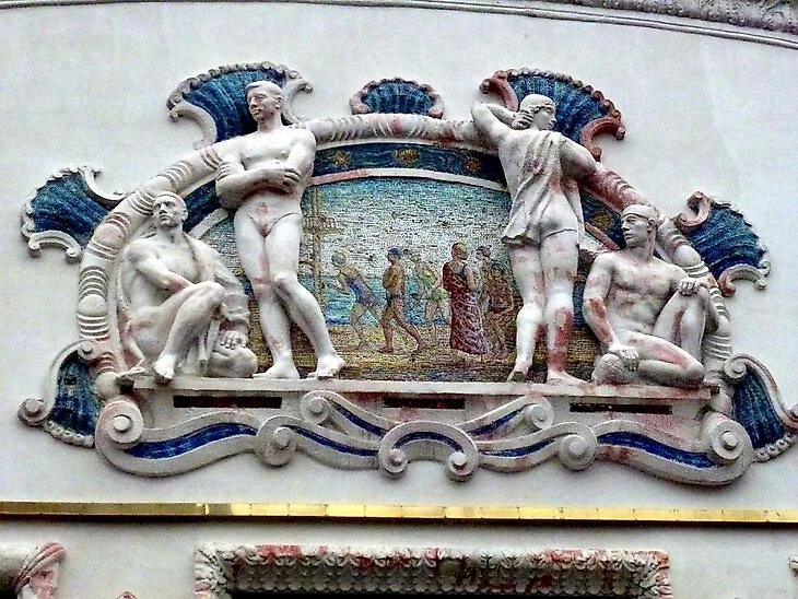 • Теперь на месте бассейна (и остальных спортивных сооружений, которые находились рядом) собираются построить ледовый дворец. Картуш Фаворского, кстати, не разрушили вместе со зданием – его сняли и перевезли. Планируется, что позже его установят на другом месте.