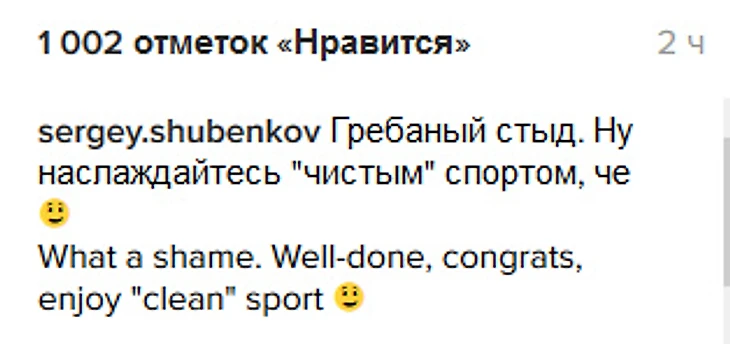 «Гребаный стыд. Ну наслаждайтесь «чистым» спортом, че», – написал Шубенков в инстаграме (орфография сохранена).