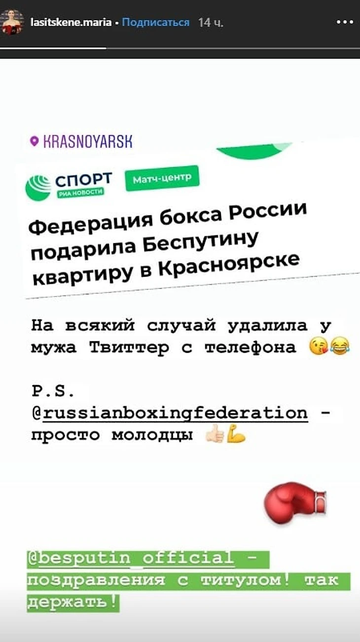 «На всякий случай удалила у мужа твиттер с телефона. P.S. Федерация бокса России – просто молодцы. Александр Беспутин – поздравления с титулом! Так держать!» – написала Ласицкене.