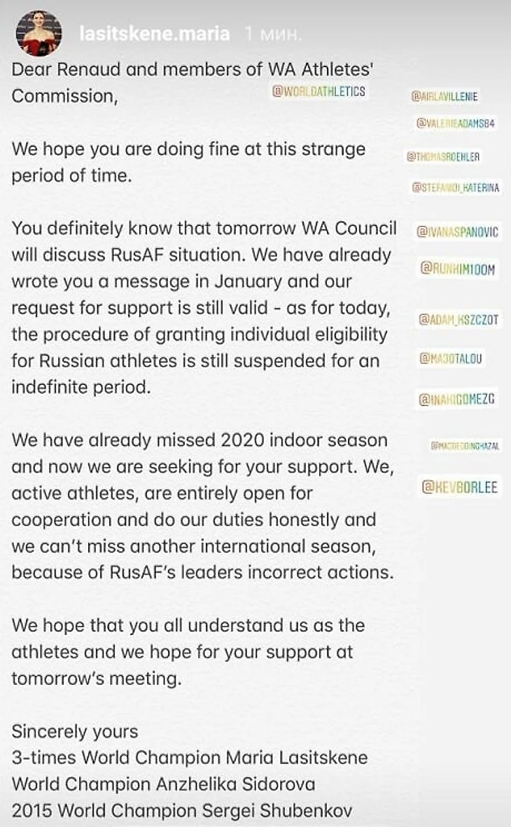 Российские легкоатлеты Мария Ласицкене, Анжелика Сидорова и Сергей Шубенков накануне заседания Совета Международной федерации легкой атлетики (World Athletics) в открытом письме обратились к представителям комиссии спортсменов организации.